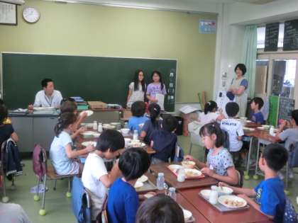 6月の歯の衛生週間にちなみ、保健給食委員会の児童が、各クラスを訪問して「食べ物をしっかりかむことは大切」ということを話しています。