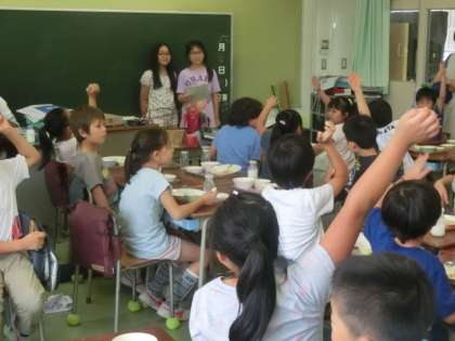 給食中に訪問し、飲みこむまでに何回程度噛んでいるのか実験です。