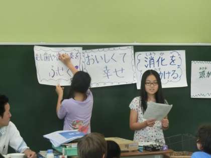 「30回を目安によく噛んで食べましょう」と伝えた後、よく噛むとどんないいことがあるのか、クイズ形式でみんなに説明してくれました。