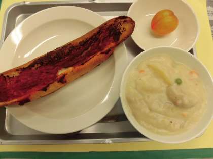献立 ブルスケッタ ホワイトシチュー 果物(プラム) 牛乳