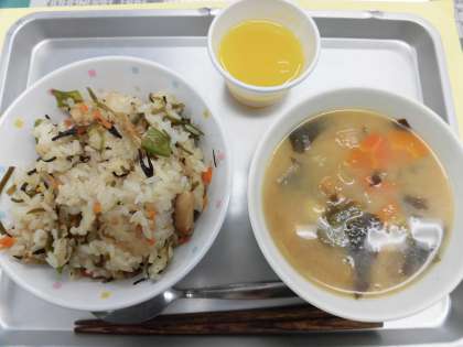 献立 磯おこわ 野菜のみそ汁 オレンジゼリー 牛乳