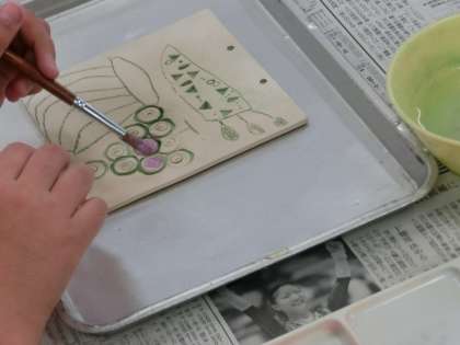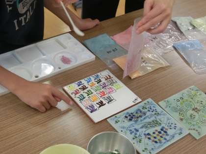 今日は講師の先生が素焼きしてくれた陶板に、釉薬を使って色付けを行いました。