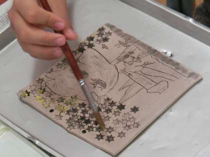 前回、ニードルやスタンプで陶板に凹凸をつけましたが、今日はこのへこんだ部分に釉薬を詰め、さらに鮮やかになるよう、釉薬を陶板に乗せていきました。