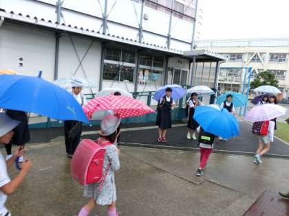 登校してきた児童の中には、去年卒業したお兄さんお姉さんたちの顔を見てニコニコと手をふる子もおり、中学生もニッコリ。