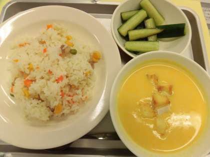 献立 三色ピラフ コーンポタージュ きゅうりのピクルス 牛乳