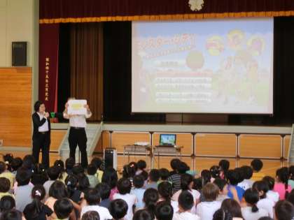 2時間目に体育館で低学年とくるみ学級の子どもたちがセーフティ教室を行いました。