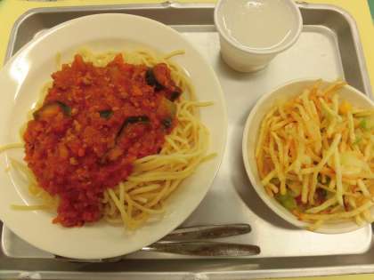 献立 なすとトマトのスパゲティ サウピカンサラダ ホワイトゼリー 牛乳
