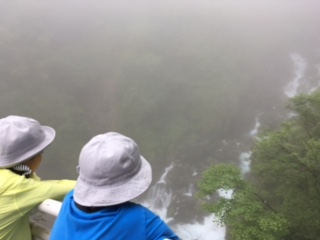 せっかくの華厳の滝も、霧で真っ白。集合写真も霧の中。