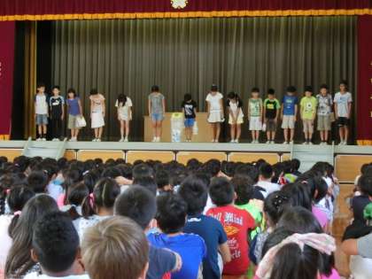 また、環境委員さんはボトルキャップ集めの説明をおこない、全校児童に協力を呼びかけました。