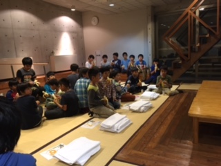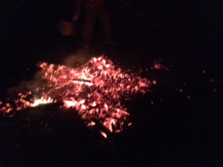 キャンプファイヤーでは、元気いっぱい楽しみました。残り火を星の形にしていただきました。大広間で、おやつのバナナと牛乳を食べました。