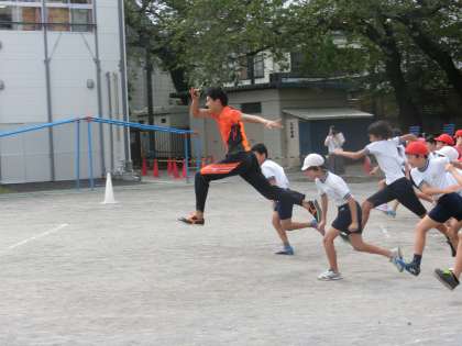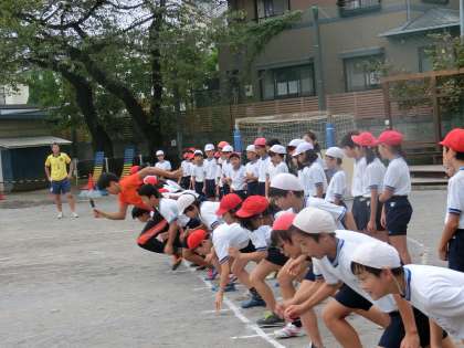 4時間目は、6年生が飯塚選手から走法やスタートの仕方などを教えてもらいました。