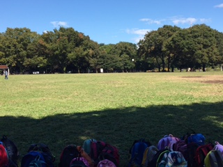 気持ちのいい代々木公園。 どんぐり拾っているかな? リュックの見張りです。