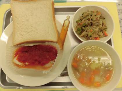 献立 食パン はちみつ メルルーサのトマトソース ABCスープ ごぼうサラダ