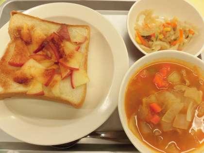 献立 アップルトースト ガルバンゾー入りミネストローネ 大根とコーンのサラダ 牛乳