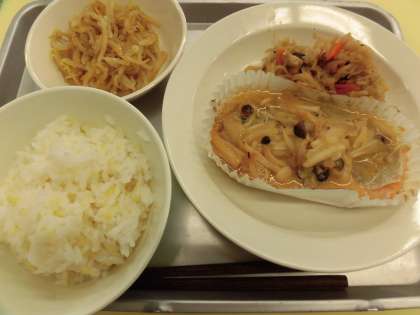 献立 元気ごはん 鮭のチャンチャ焼き 切り干し大根の煮付け もやしのカレー醤油あえ 牛乳