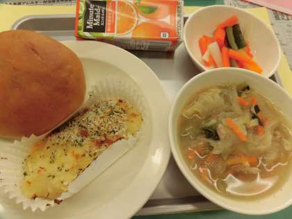 献立 あしたばパン ポテトのクリーム焼き 千切り野菜スープ 三色ピクルス 飲み物リザーブ(牛乳 コーヒー牛乳 アップルジュース オレンジジュースの中から一つ選び予約しました)