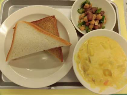 献立 二色サンド パンプキンシチュー ビーンズサラダ 牛乳