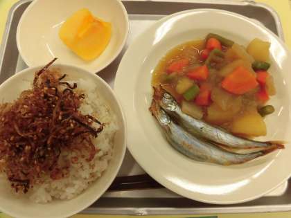 献立 麦ごはん かみかみ佃煮 やきししゃも 野菜の煮物 果物(柿)牛乳