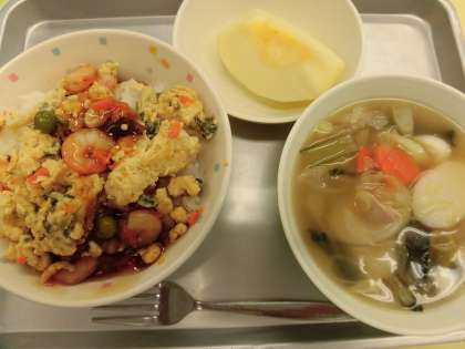献立 天津丼 トックスープ 果物(りんご) 牛乳