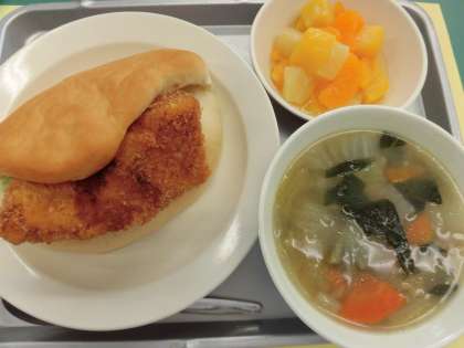 献立 イカフライサンド 白菜スープ フルーツカクテル 牛乳