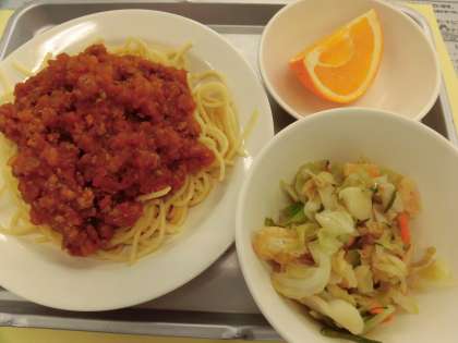 献立 スパゲティミートソース カリカリ油揚げのサラダ 果物(ネーブルオレンジ) 牛乳