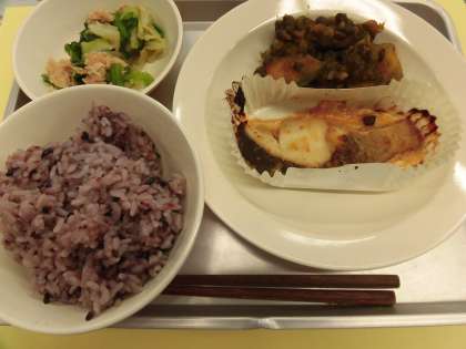 献立 黒米ごはん タラのゆず味噌焼き カボチャのいとこ煮 小松菜とキャベツのツナあえ 牛乳