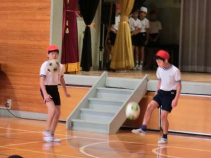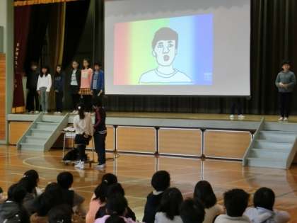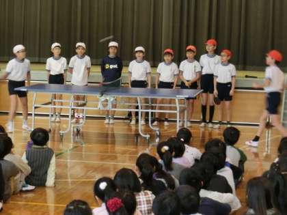 クラブ発表が行われ、今朝は「校庭スポーツクラブ」「卓球クラブ」「パソコンクラブ」「造形クラブ」のみんなが、自分たちのクラブ活動を紹介してくれました。