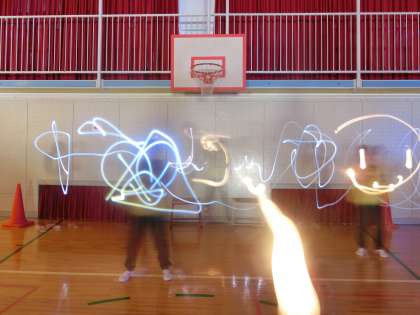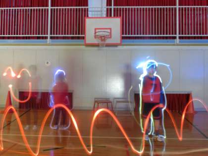 「光のクレヨン」と題された造形活動で、カメラのスローシャッター機能を使い、光跡が描き出す不思議なイメージを楽しみます。