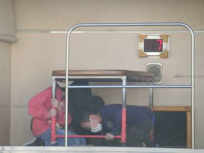 その後、4年生は起震車に乗り込み、大きな地震とはどのようなものか体験しました。机の下に潜り込んでも机が動いてしまうので、机の脚をしっかりつかんで身を守りました。