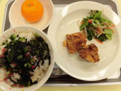献立 梅茶漬け 鶏肉の唐揚げ ごまあえ くだもの(ぽんかん) 牛乳