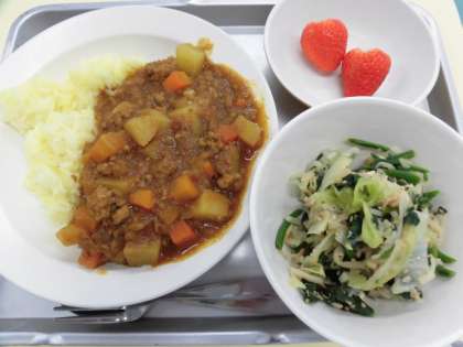 献立 ターメリックライス キーマカリー 鉄骨サラダ くだもの(いちご) 飲むヨーグルト