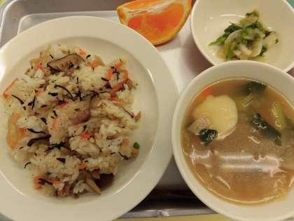 献立 五目ごはん すいとん かぶのレモン漬け くだもの(でこぽん) 牛乳