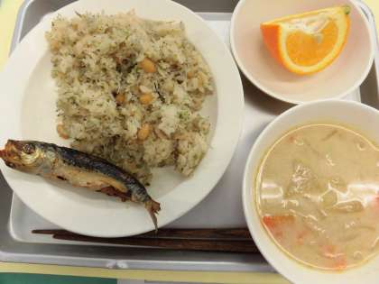 献立 節分ごはん いわしの丸干し 飛鳥汁 果物(いよかん) 牛乳