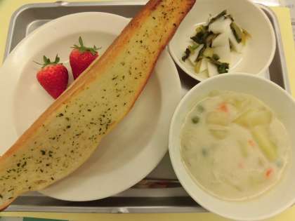 献立 ガーリックトースト ホワイトシチュー かぶのピクルス 果物(いちご) 牛乳