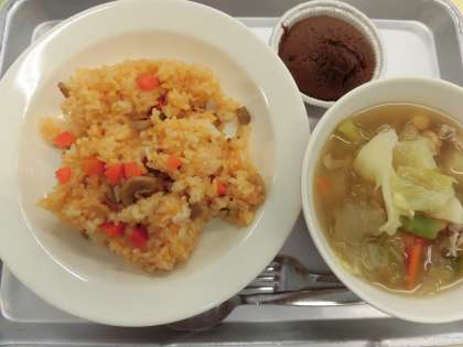 献立 チキンライス ひよこ豆と野菜のスープ 手作りチョコケーキ 牛乳