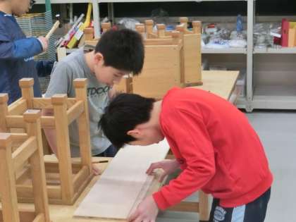 在校生のために雑巾を縫うチームは、ミシンと格闘。ペンキのはげたサッカーゴールを真っ白に塗り直すチームは、自分の腕まで白くなりました。