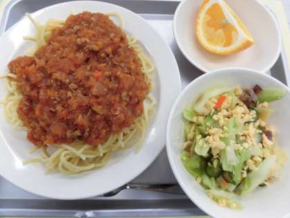 献立 スパゲティミートソース 炒り卵サラダ 果物(スイートスプリング) 牛乳