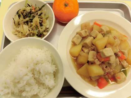 献立 ごはん 肉じゃがうま煮 なんでもせん切りサラダ 果物(みかん) 牛乳