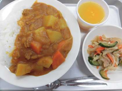 献立 カレーライス こんにゃくサラダ 丸ごとみかんゼリー 牛乳