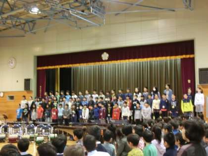 合奏の後は6年生から贈り物として「サッカーゴールを真っ白に塗り直したこと」「各クラスに雑巾を用意したこと」「"ストップ君"を新調したこと」など在校生へのプレゼントが紹介されました。。