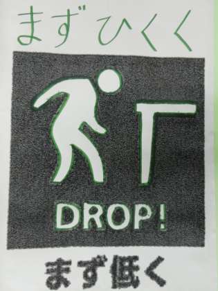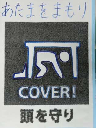 その後、「シェイクアウト訓練」の説明と練習が行われました。これはアメリカ発祥の訓練で、合図と同時に「DROP!」「COVER!」「HOLD ON!」の順番で身を守る訓練です。