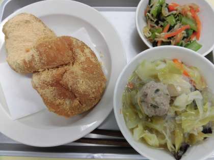 献立 きなこ揚げパン キャベツと肉団子のスープ ナムル 牛乳