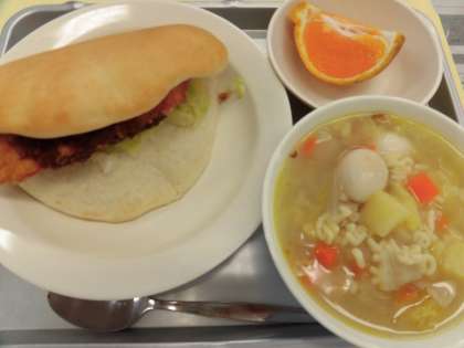 献立 セルフフィッシュサンド ABCスープ 果物(でこぽん) コーヒー牛乳
