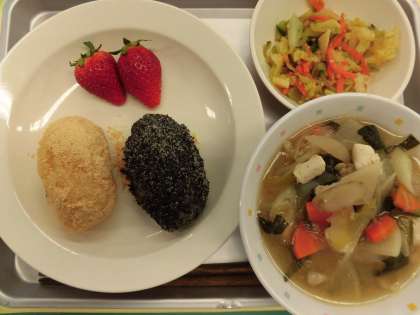 献立 二色ぼたもち 豚汁 野菜のごま酢あえ 果物(いちご) 牛乳