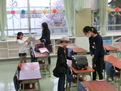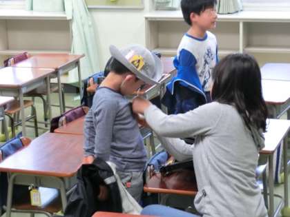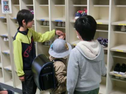 靴をはきかえてから、ランドセルをロッカーにしまうまで手伝ったり、やり方を教えたりしてくれています。