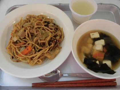 献立 ソース焼きそば、わかめスープ、りんごゼリー、牛乳