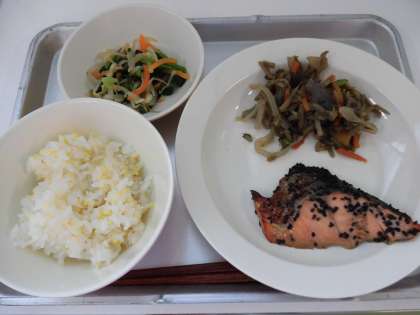 献立 元気ご飯、鮭の南部焼き、五目きんぴら、野菜のからしじょうゆ和え、牛乳