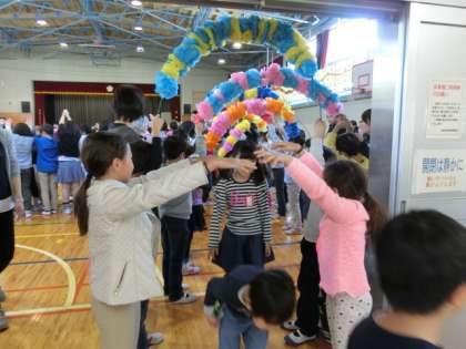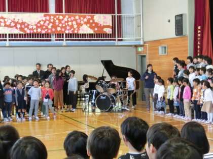 迎える会の最後は、みんなで「勇気100パーセント」を合唱。みんなが一丸となって、やっと新しい下北沢小学校がスタートした感じです。