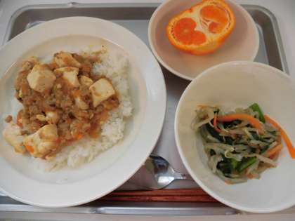 献立 麻婆ライス、塩ナムル、果物(なつみ)、牛乳