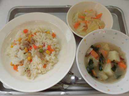 献立 三色ピラフ、じゃが芋とベーコンのスープ、キャベツサラダ、牛乳